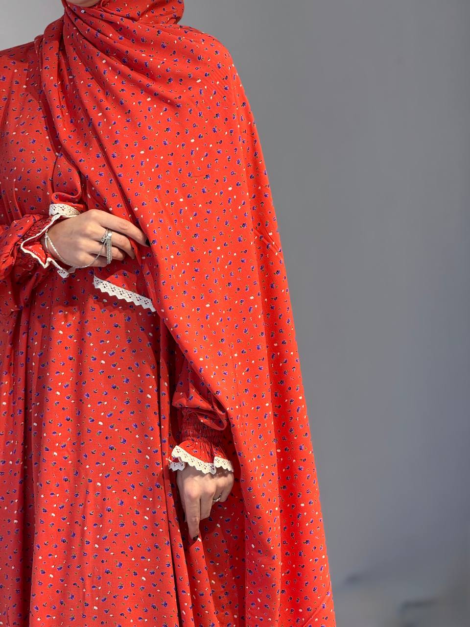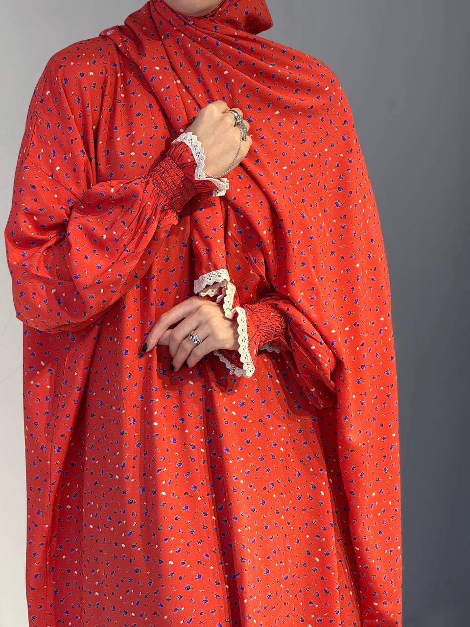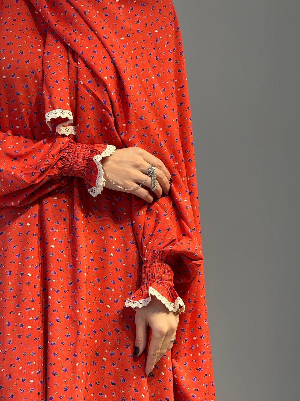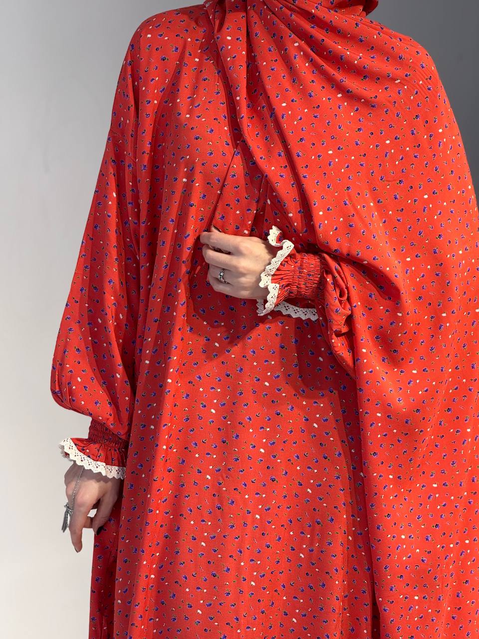 The vibrant red base with delicate floral patterns adds a cheerful, feminine touch. The sleeves feature smocked cuffs and white lace details for a handcrafted elegance. The dress comes with a matching **scarf** that is **not attached to the garment**, allowing you to wear it in multiple ways to suit your personal style.🍁