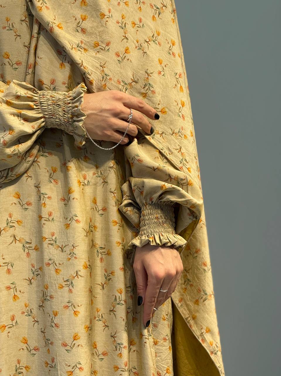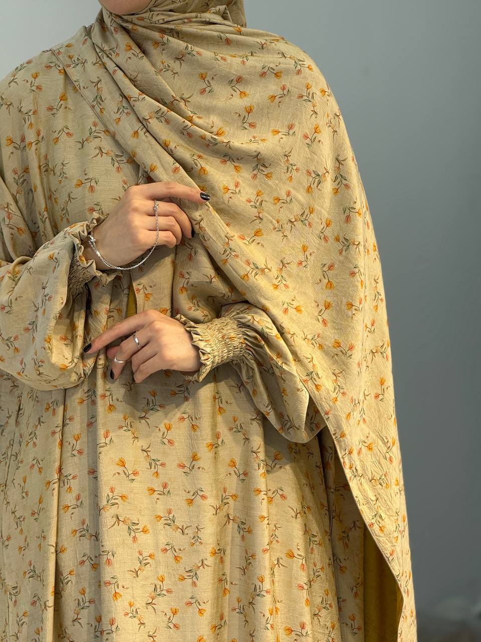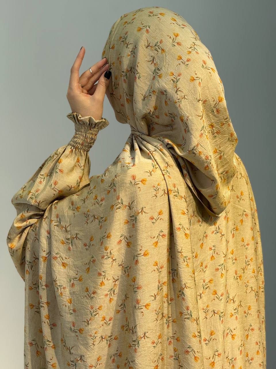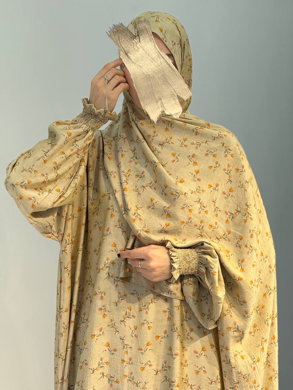 📜This prayer dress exudes calm and charm with its delicate floral print in warm tones on a soft beige background. Made from Tencel Cupra, a plant-based fiber derived from cotton, the fabric is breathable, silky to the touch, and flows beautifully.