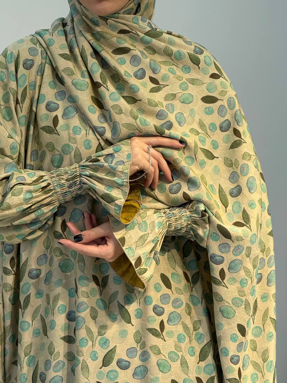 The beige fabric features a delicate leaf pattern in green and blue tones, evoking serenity and a natural touch. Its loose one-size fit flatters various body shapes, while the elastic cuffs add comfort and charm.